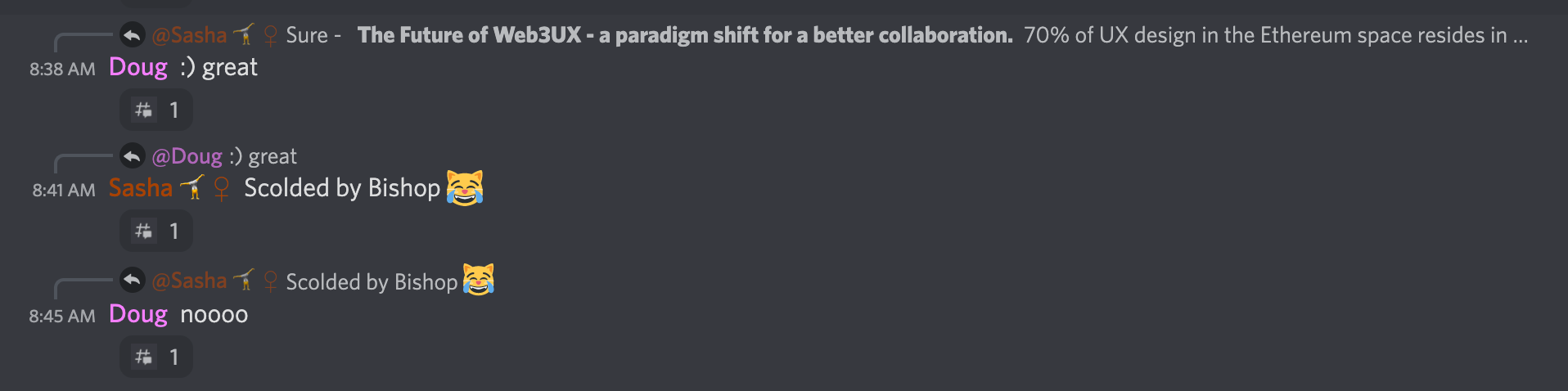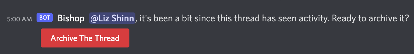 Bishop is our newest team member and is our friendly discord bot written in discord.js. Since inception he's taken up some additional duties, but relevant to this post, he automates three things around the threading process:
