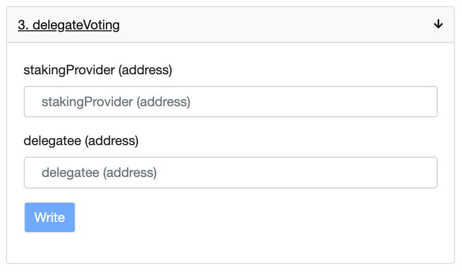 - Select a delegate address for governance/voting purposes (it can be your own staker address). We will release a governance dashboard shortly, but for now you will need to use Etherscan. You will need to input the stakingProvider address you're delegating from and the delegatee address to vote/participate in governance on your behalf (in most cases this will be the same address).