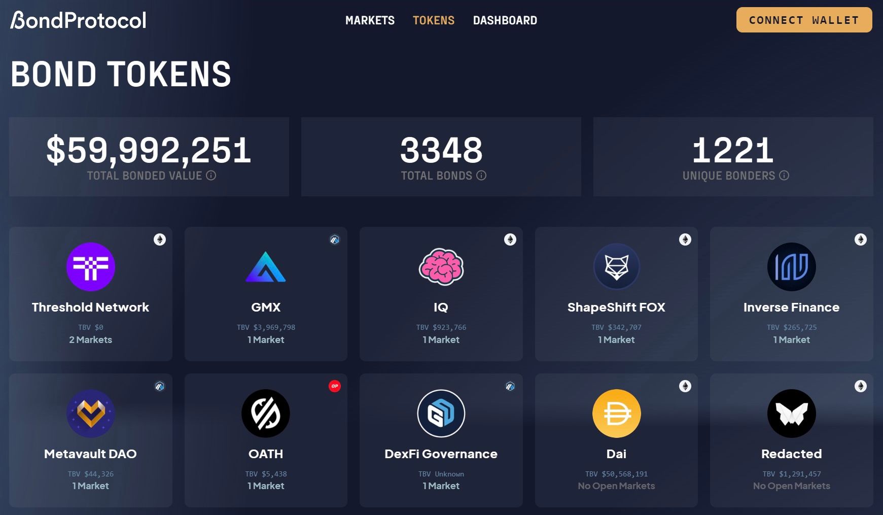 Bond Protocol revolutionizes the traditional fundraising model by providing permissionless bond marketplaces, where issuers can easily deploy a bond market and offer tokens at set or variable exchange rates for other ERC-20 tokens or liquidity pool tokens. Other key features include composability of Bond Tokens for secondary markets and a modular framework for flexibility and adaptability. Since launch in October 2022, Bond Protocol has facilitated ~$60M total-bonded-value (TBV) and has been utilized by over 20 protocols.
