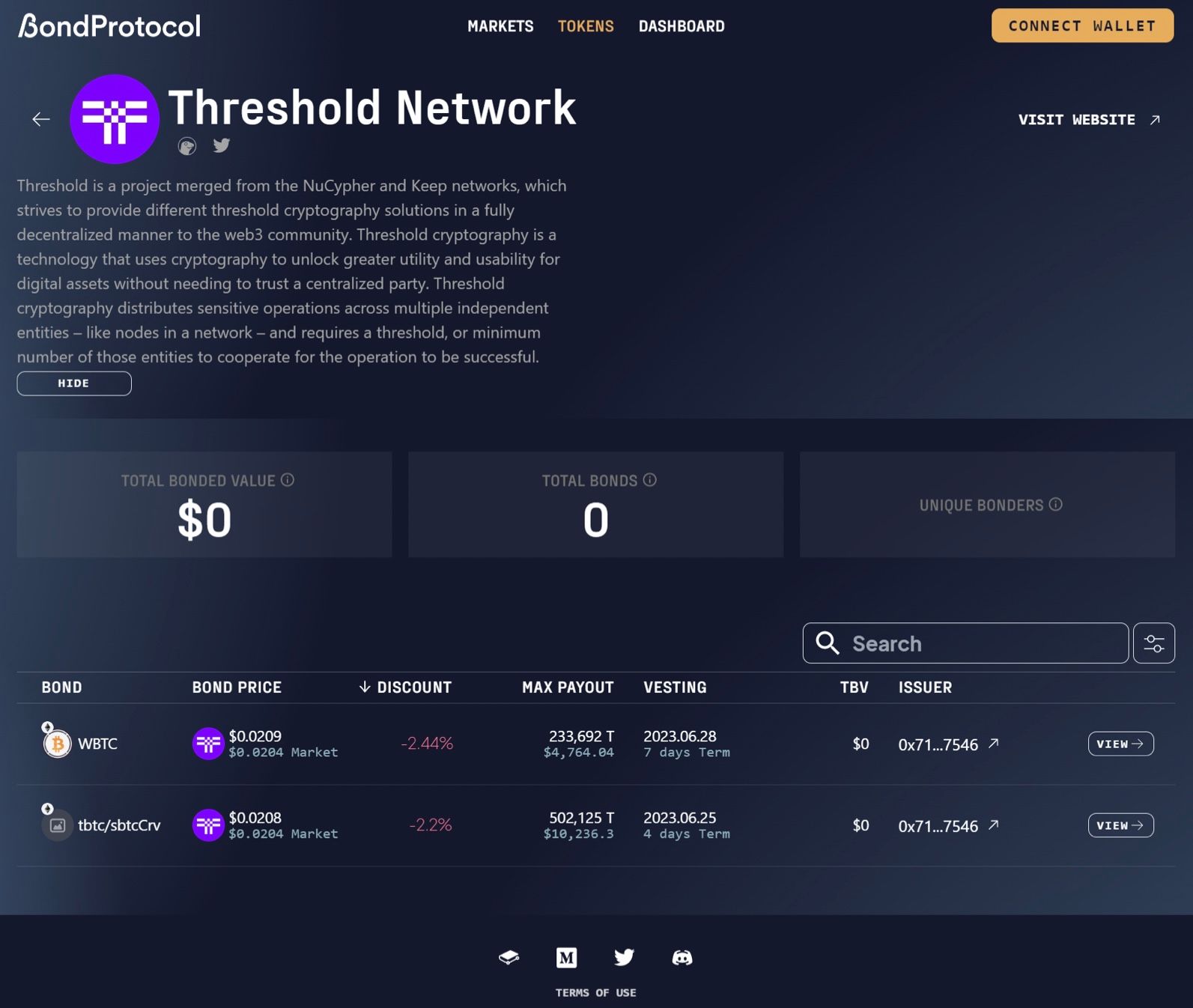 As part of Threshold’s efforts to increase awareness and usage of tBTC, today we launch our first bonding program, which allows people to swap tokens they hold (e.g., WBTC or Curve LP tokens) for discounted Threshold work tokens (T) that are delivered after a period of time (the maturity of the bond). This process is managed by the Bond Protocol in a trust-minimized manner.